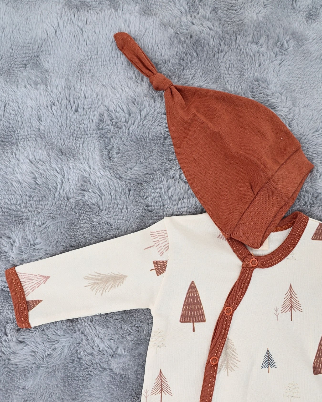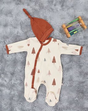 Yenidoğan Bebek Tulum / %100 Pamuk / Çıtçıtlı / Bej-Ağaç Desen