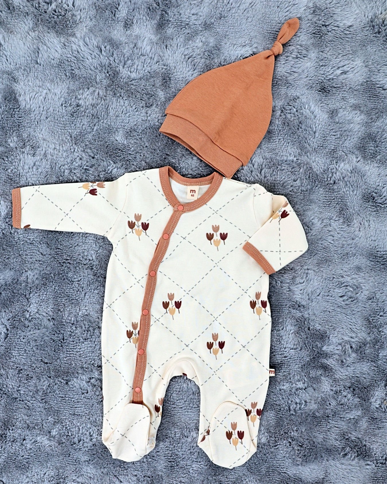 Yenidoğan Bebek Tulum / %100 Pamuk / Çıtçıtlı / Ekru Çiçekli